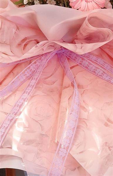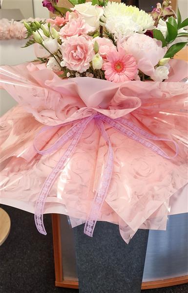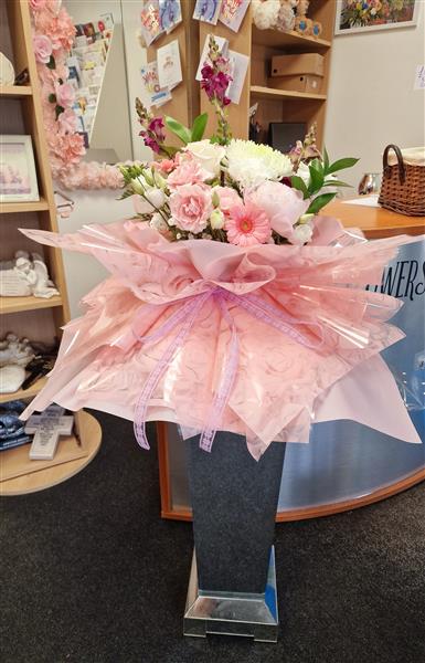 Beautiful pinks and whites arranged in a pink skirted box and finished off with a pink ribbon