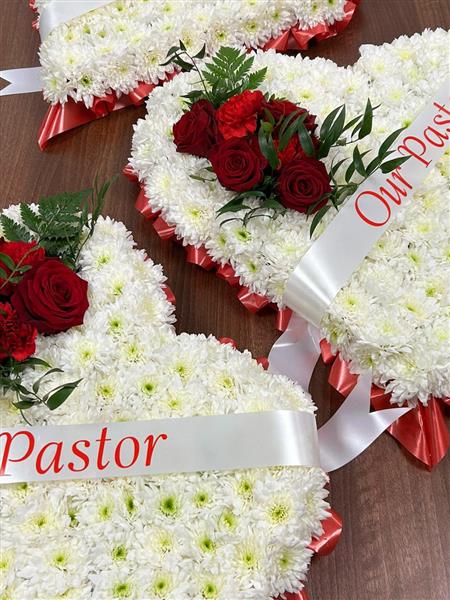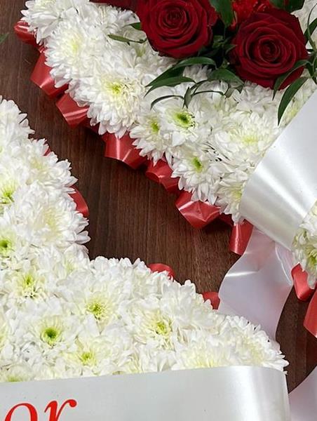 A traditional Based white heart with beautiful floral spray and delicate pleated ribbon in colours of your choice