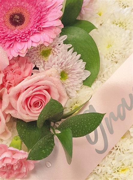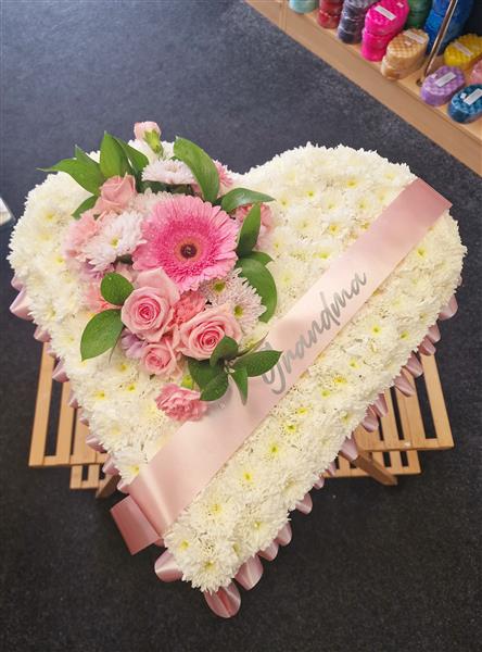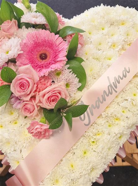 Based white chrysanthemum heart with pale pink pleated edging and floral spray