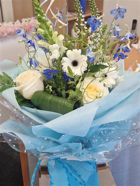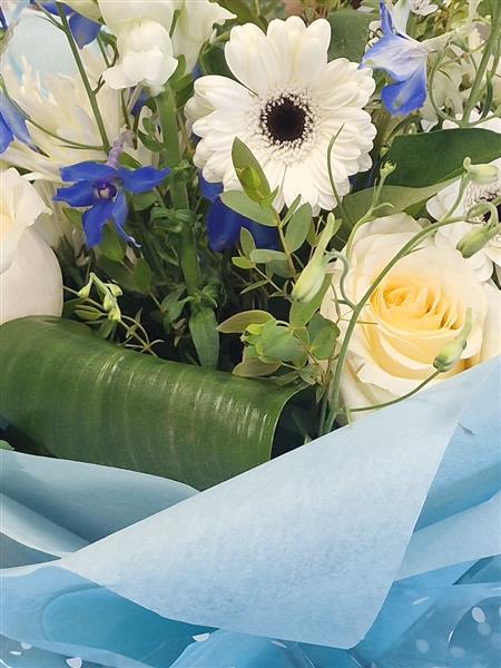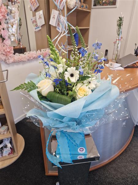A florist choice selection of seasonal blue and cream flowers arranged and presented in a box with water