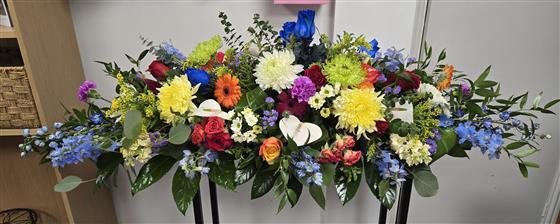 Beautiful bright and vibrant casket spray filled with stems of florist choice flowers