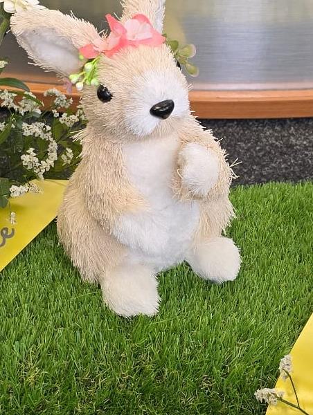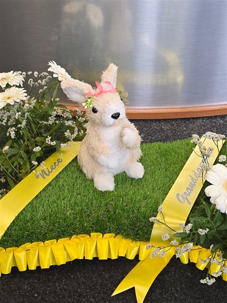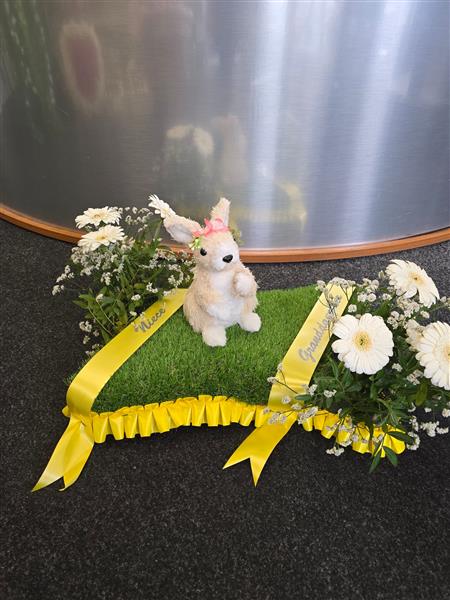 A garden display of a bunny on his lawn with floral spray that can be personalised in any colour