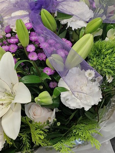 white carnations with white lillies and other seasonal flowers prepared with carefully selected foliage an arranged a box with water