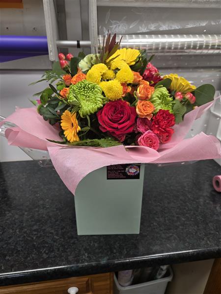 A vibrant and lively boxed arrangement of beautiful bright flowers including roses and carnations with lush foliage, a bouquet to bring joy and brightness to any occasion.