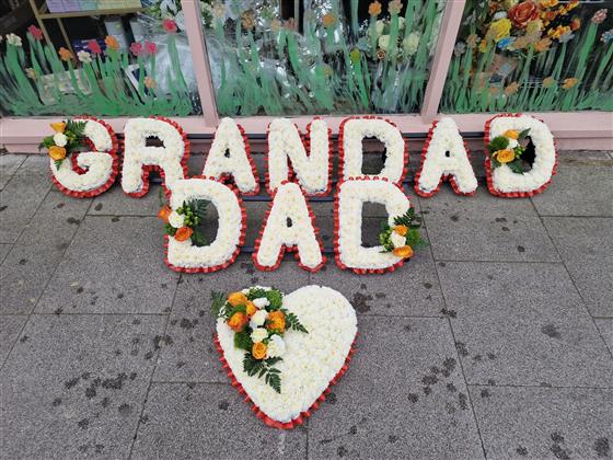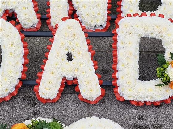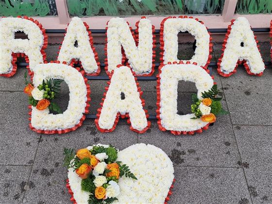 Based funeral letters delicately edged in pleated ribbon with floral spray in colour of your choice.