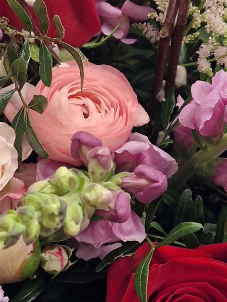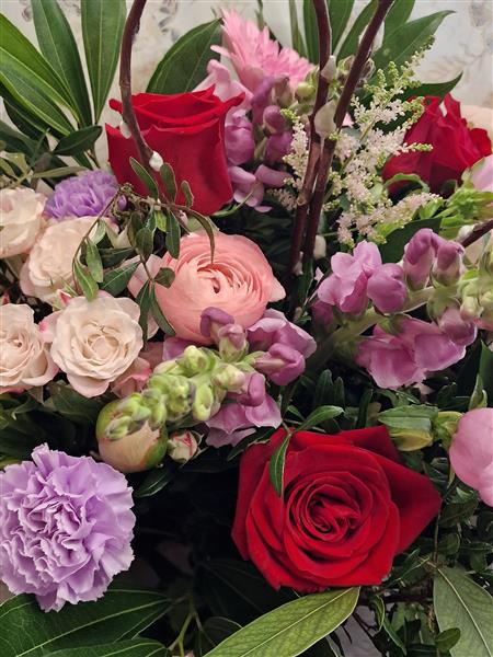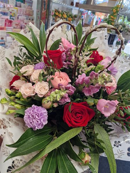 a hand-tie of love, Roses, carnations, snaps, ranunculus and campanula wrapped together with other seasonal stems and foliage and a twined heart of willow