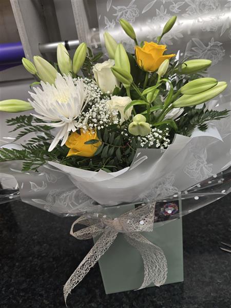 Beautiful lily and rose box with Chrysanthamum blooms and gypsophelia