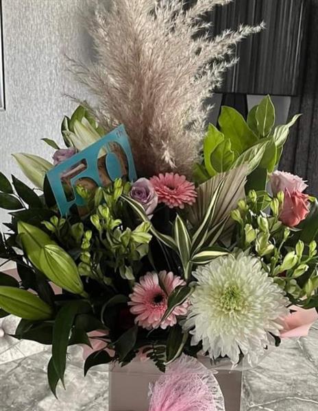 A beautiful bouquet of white lily, pink Gerbera and white chrysanthemum blooms presented with other seasonal stems and pampas