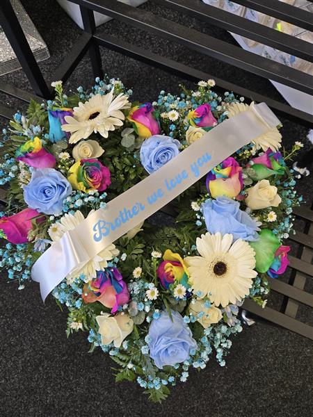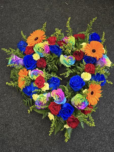 A beautiful mix of rainbow roses, lush roses and flowers laid in an open heart tribute