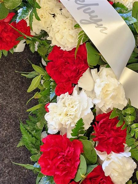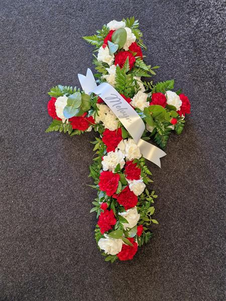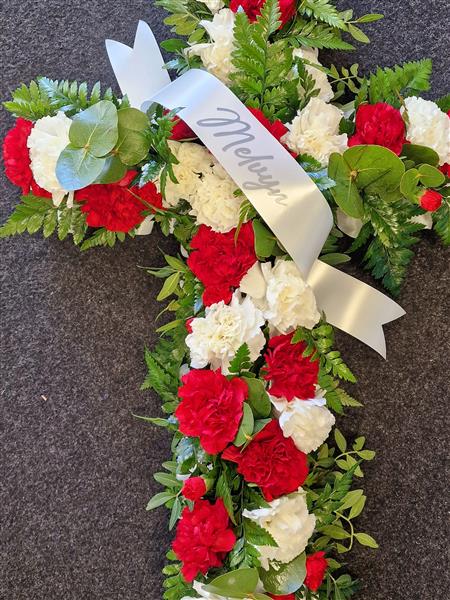 2ft Cross created in a loose style with red and white carnations and edged with leather leaf foliage