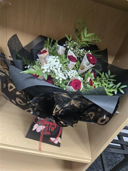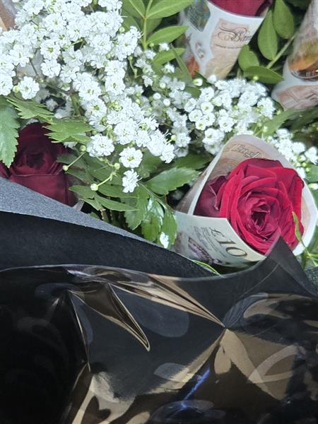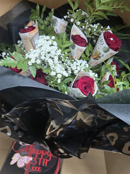 A gorgeous bouquet of roses each individually wrapped in a money note, an alternative way of gifting money to a loved one and personalised with an acrylic disc.