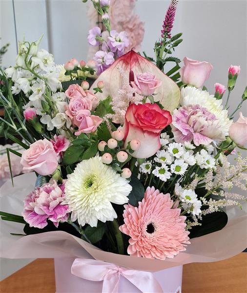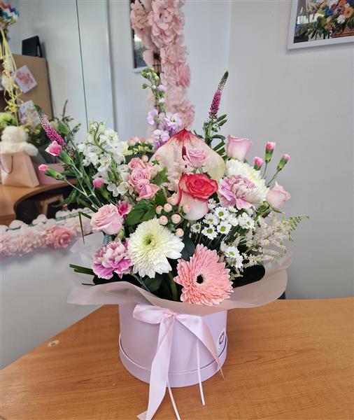 A selection of beautiful pale pink and white Germini, roses and carnations with other seasonal flowers arranged in a hatbox display