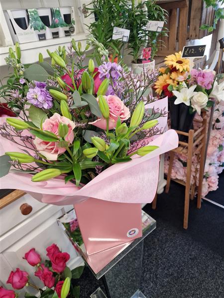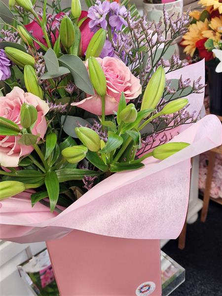 A selection of blooms that reflect the seasons from winter snow to summery pink carefully arranged and delivered in a hand tied box