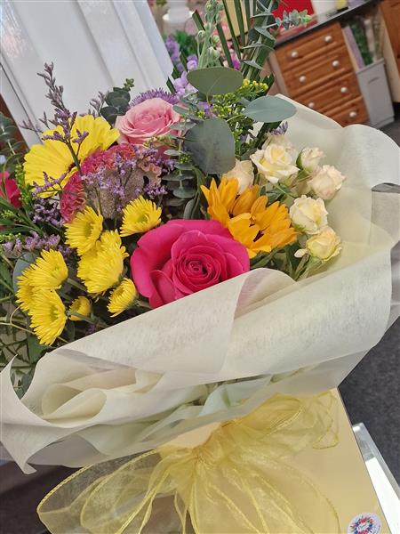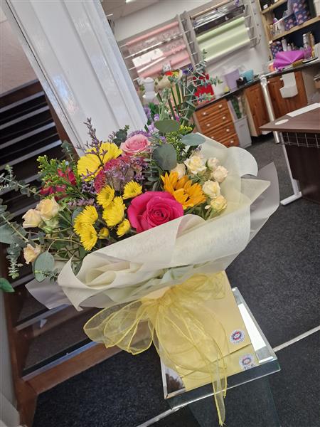 A traditional florist choice boxed bouquet of delightful seasonal flowers and foliage, perfect for any occasion