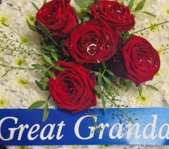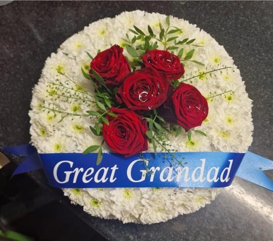 Beautiful white chrysanthemum based posy with rose insert and personalised ribbon edged with delicate pleated ribbon